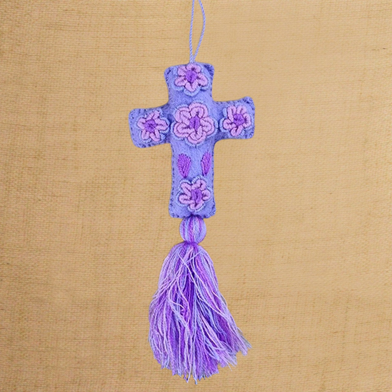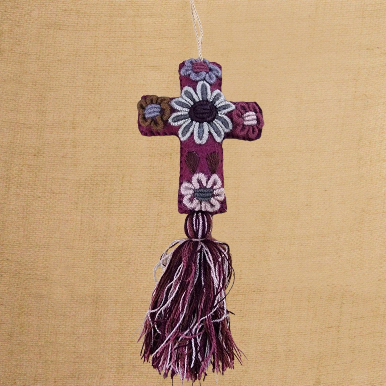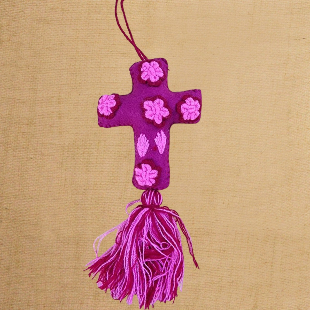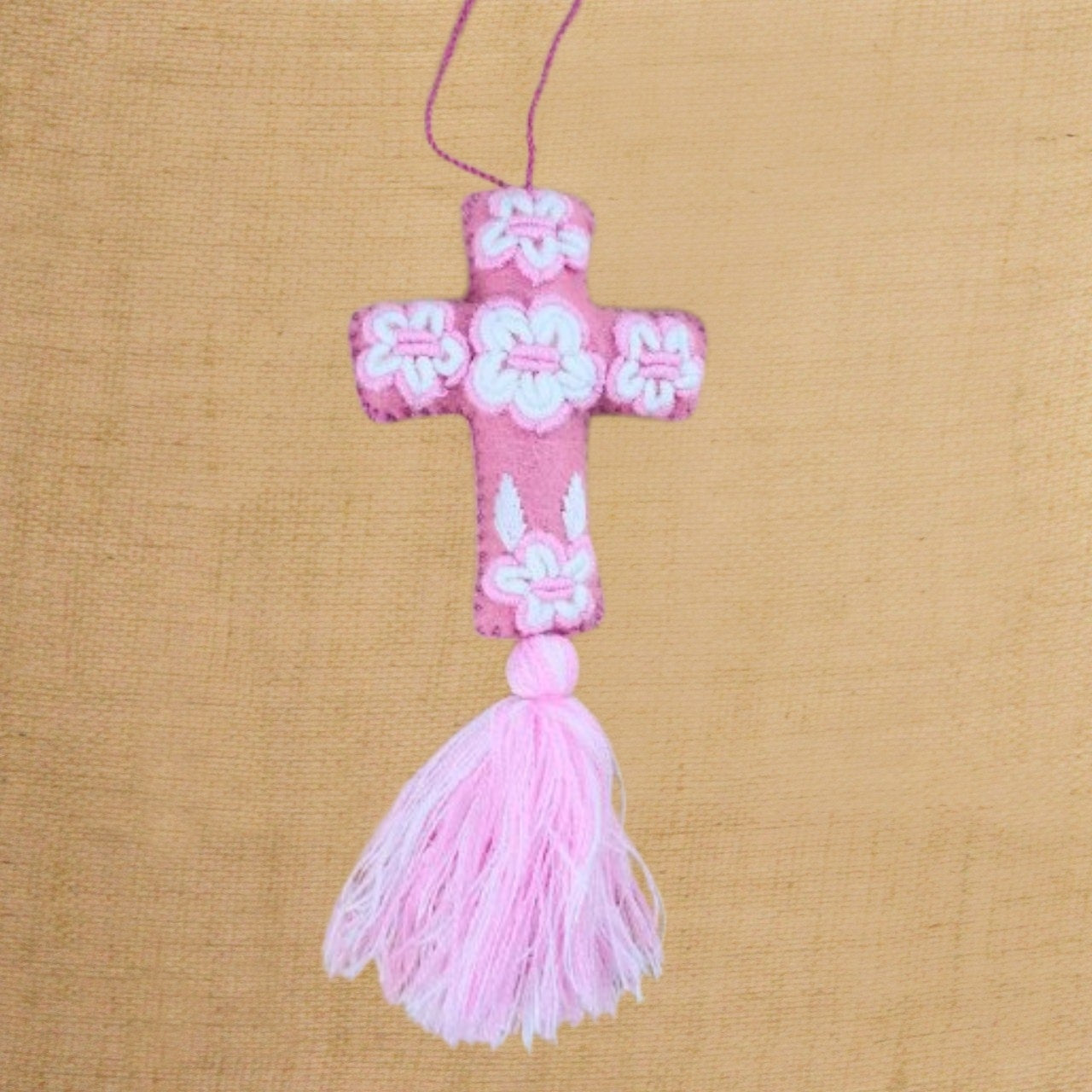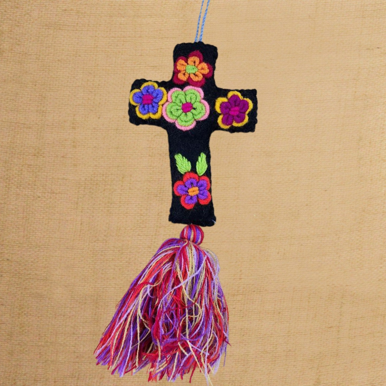 Figura de Cruz bordada de flores multicolor, esta hecho de fieltro y bordado con hilo, cuenta con hilo para colgar.