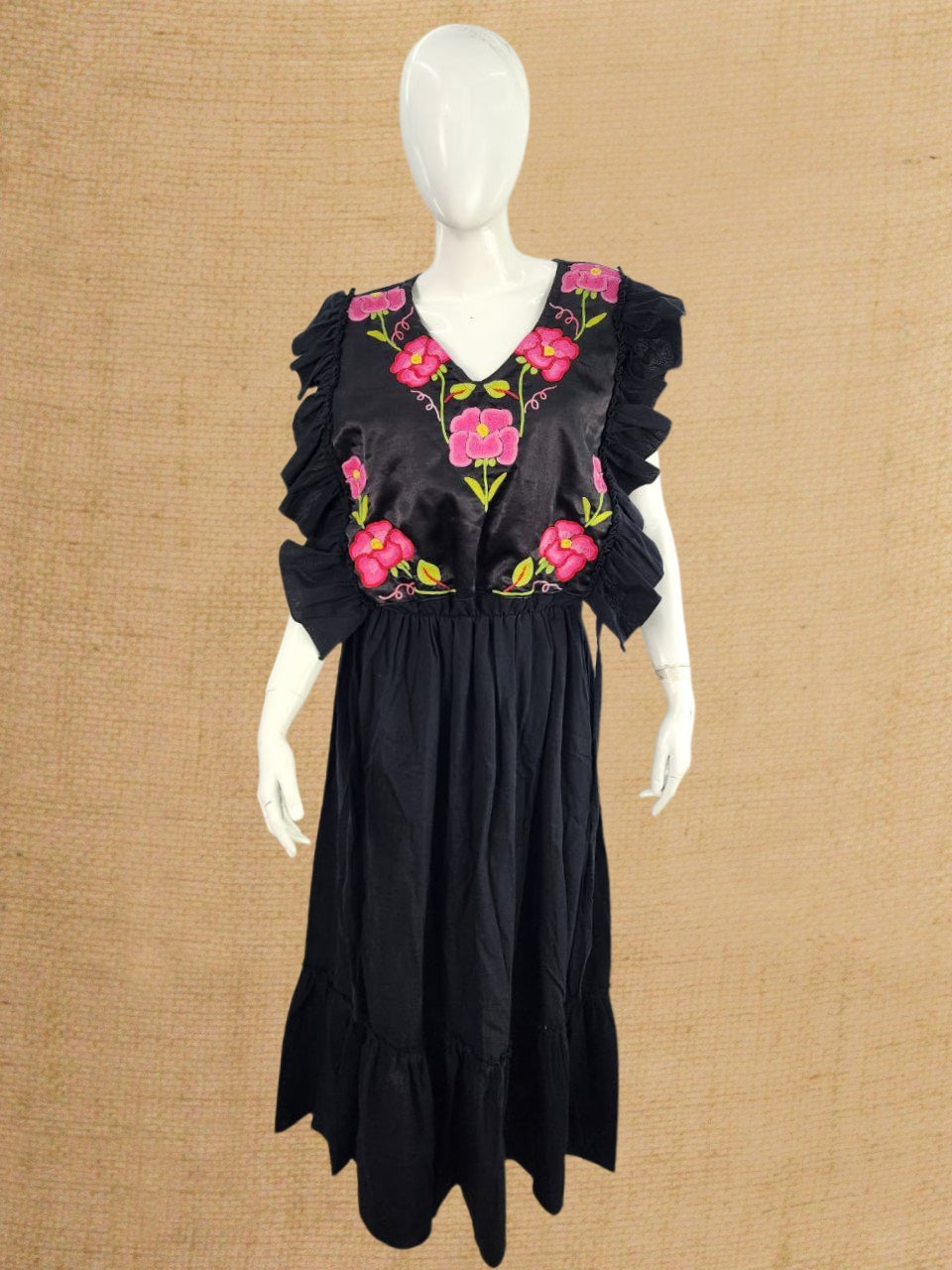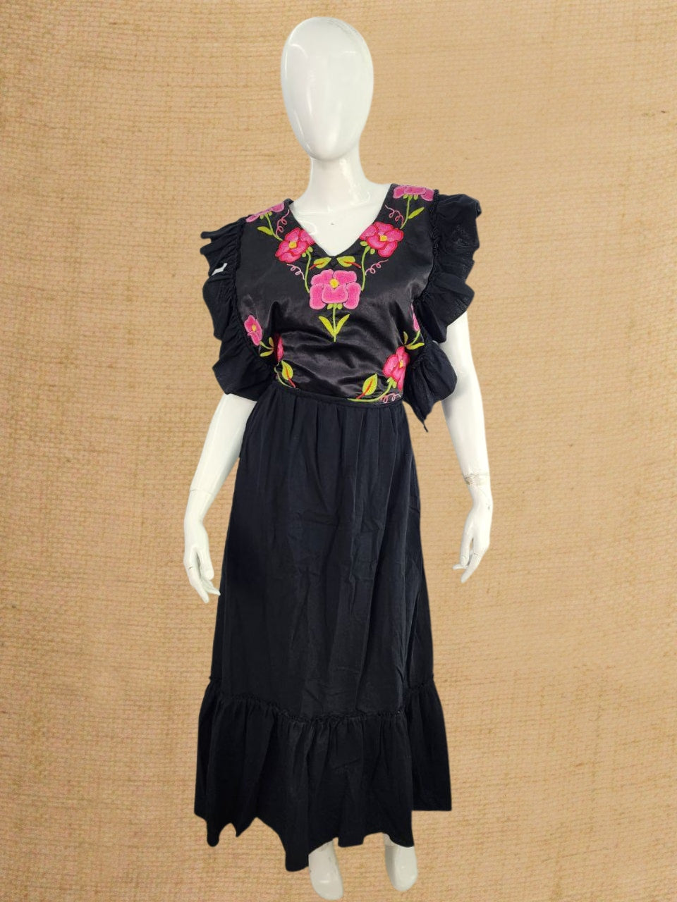Este vestido largo de Chiapas, destaca por su pechera artesanal elaborada en máquina de pedal, mostrando el talento de los artesanos locales. Diseñado con listoncillos en el pecho para un ajuste personalizable, combina tradición y confort.