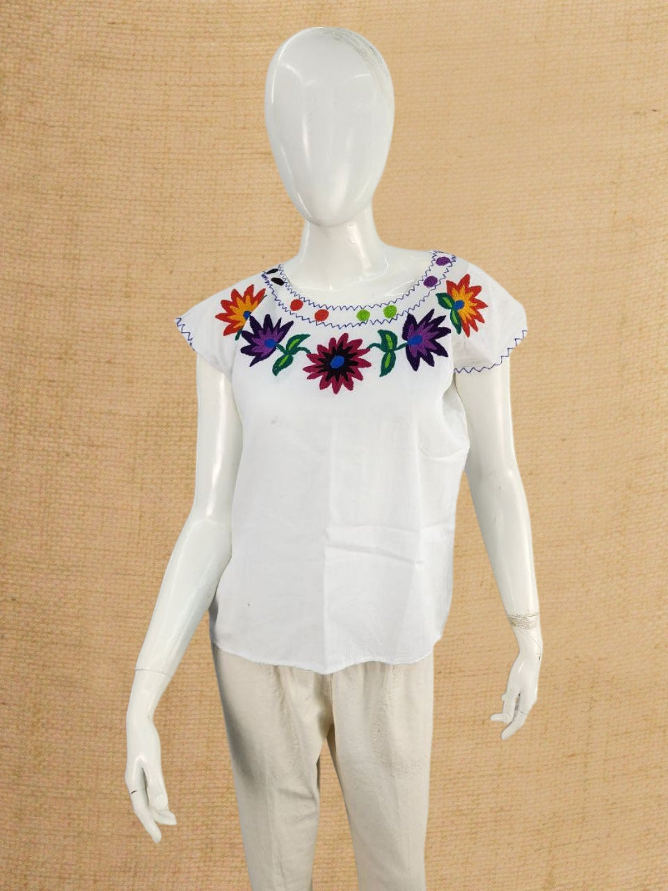 Blanket blouse, very fresh fabric with pedal machine embroidery from the Ocosingo Chiapas region, small sleeves, square neck and pleats.